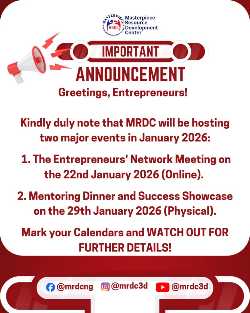 Masterpiece Resource Development Center (MRDC) invites all entrepreneurs, business owners, and startup dreamers to our Entrepreneurs’ Network Meeting — a space to connect, collaborate, and learn from like minds.